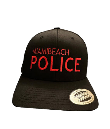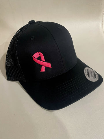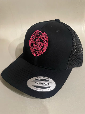 Black trucker hat with Miami-Dade Police badge in pink to support breast cancer awareness.
